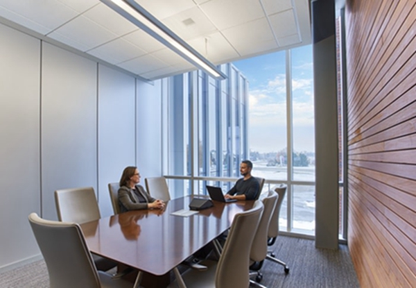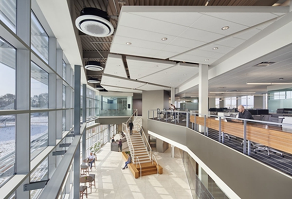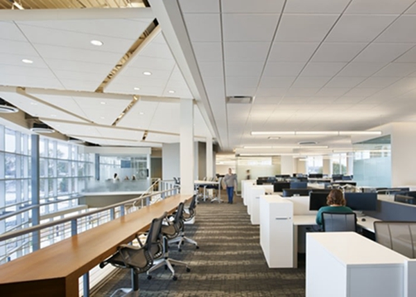 该公司办公室装修方案将员工的福利放在首位。中庭将自然光带入内部空间,充足的反光材料创造出明亮且无眩光的工作区域。开放式协作区、休息区、封闭式会议室、站立式办公桌和长凳座位的混合提供了互动和个人工作的多种选择。宽敞的中央楼梯带有雕塑感的细节和温暖的木质装饰,则提供了另一个非正式的聚会场所。