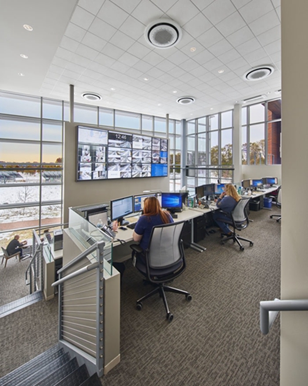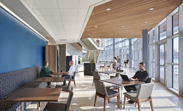 中庭设有咖啡厅和休息区,可通向季节性的室外露台,俯瞰舒适的大草原环境。尽管该地点需要大量的挖掘工作才能形成水盆和雕刻的地形,但其结果是自然景观,可以将水固定在现场,不需要额外的灌溉。碎石人行道鼓励工人采取健康的休息时间,漫步在草原草丛中。员工还可以使用室内健身室以及二楼露台,该露台为夜班工人提供了呼吸新鲜空气的安全场所。