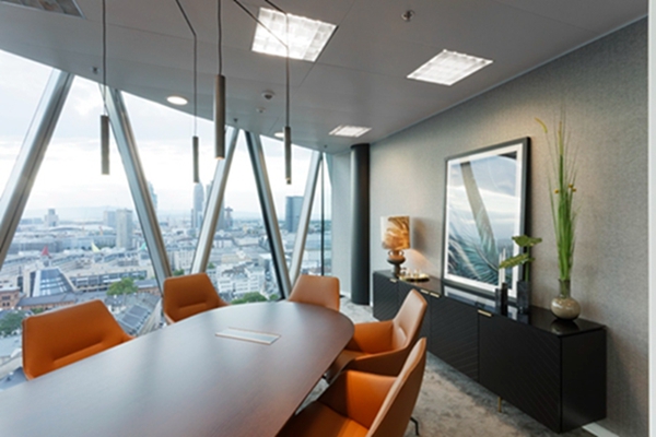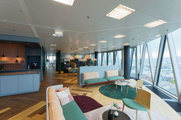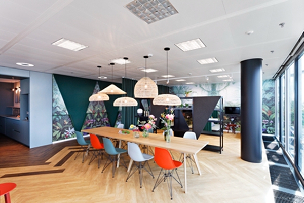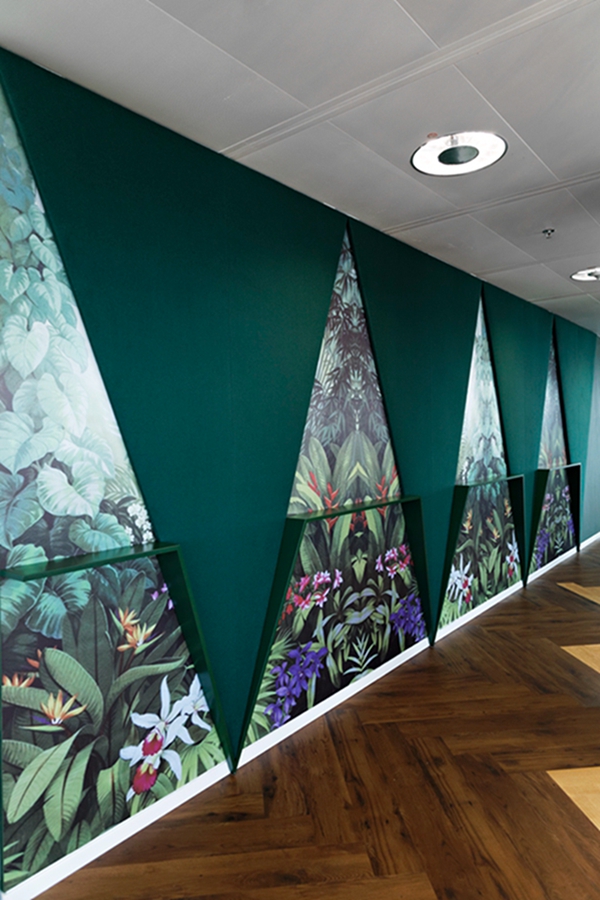 办公室共享空间的主题是“城市丛林”,其纺织墙纸图案在核心墙上营造出被绿色包围的感觉,其他区域的设计色彩丰富,可作为休闲区和休息区。设计公司重新解释了外墙的三角形形状,核心墙和房间隔板上有墙纸。开放式厨房构成了共享空间的中心部分,大胆的红色家具在房间内树立了独特的色彩。