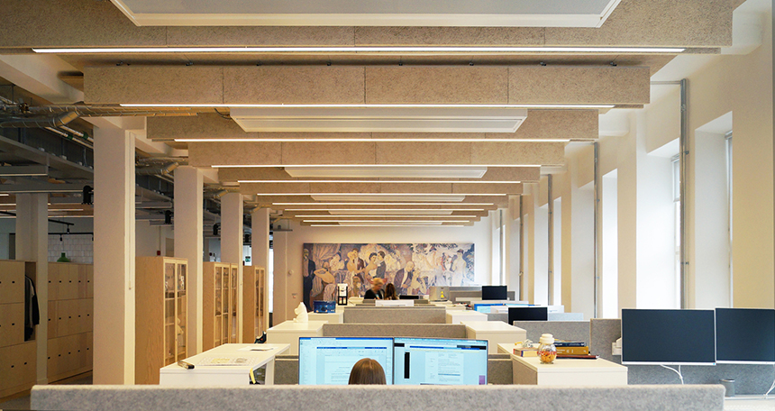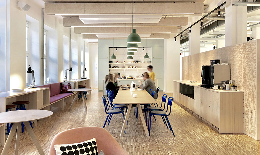 办公室室内设计致力于创造一个多功能的工作空间,通过定制的橱柜以及室内装饰的数控壁画,使得建筑兼具展示公司经典的斯堪的纳维亚品牌的功能。