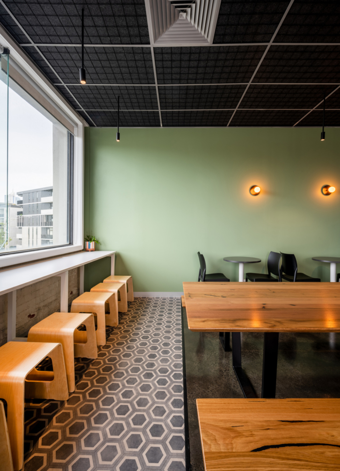使用不同的纹理开启穿越整个空间的色彩之旅。用户看到的第一个颜色是接待柜台上令人惊叹的粉红色水磨石,然后通过地板上鲜艳的地毯箭头将您带入整个空间。柔和的墙面色彩和隔音板放置在整个空间中,以增强视觉刺激性和声学品质,这些柔和的色彩与选定墙壁上垂直木板的柔和质感相呼应。