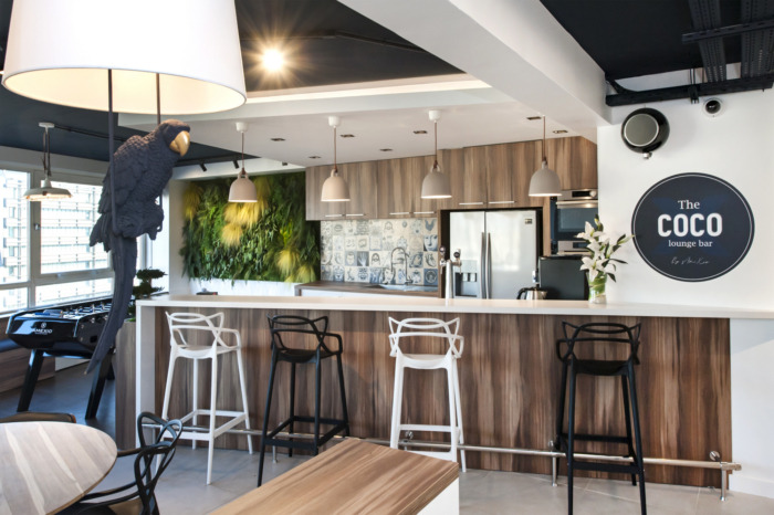 现代办公室装修设计更加注重空间给人的包容度和热情,在入户前厅设置了一个迎宾吧台,用户进入空间可以感受到亲切和归属感。