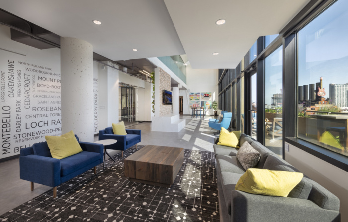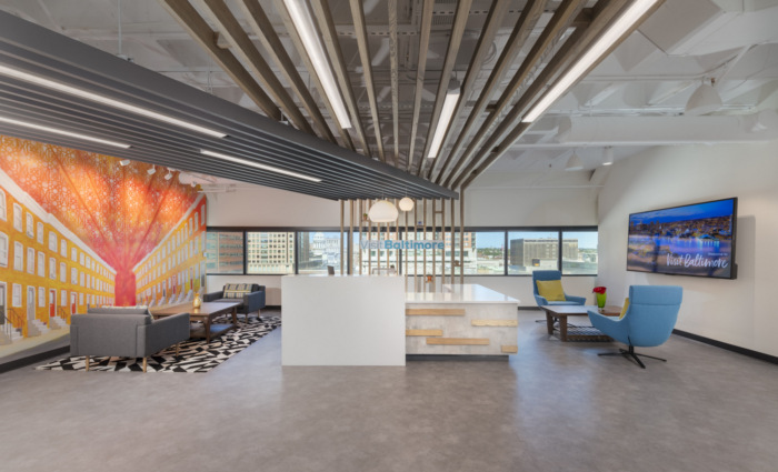 巴尔的摩的真实感觉被编织到办公室里,以讲述一个故事和荣誉,该组织每天都在推销“魅力之城”。泡泡糖粉红色的墙纸上点缀着柠檬薄荷棒的图像、带有大理石弯头的经典砖排房屋外墙以及专为城市中每个居民区建造的墙,都是对这一荣誉的致敬。
