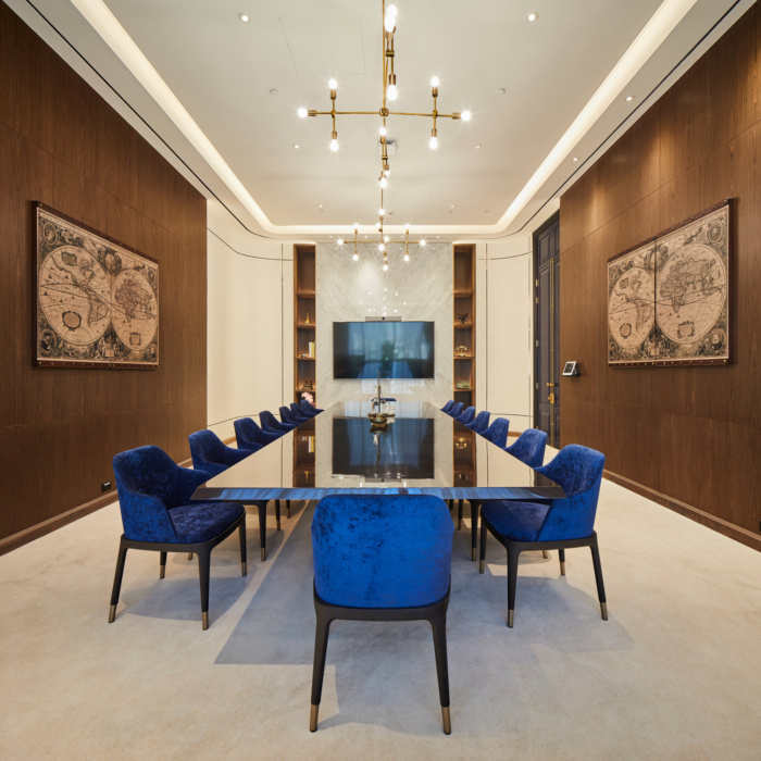优雅的大门通向私人会议室,每间会议室都讲述着不同的设计故事。每个房间都是根据客户的性格和要求创建的,配有标志性家具、定制地毯以及颜色和图案、纹理和饰面,这也反映了该银行的历史相关点。#现代生物科技办公室装修#
