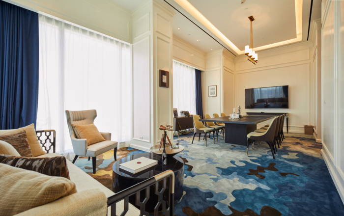 从门打开进入电梯大堂的那一刻起,就营造出热烈而华丽的欢迎氛围。木质板条墙饰面和深胡桃木饰边,带有醒目的黄铜门把手的雕像式法式门廊通向舒适而豪华的客户休息室,采用铂金和金色搭配灰褐色、棕色和奶油色,营造出郁郁葱葱的丰富色调。