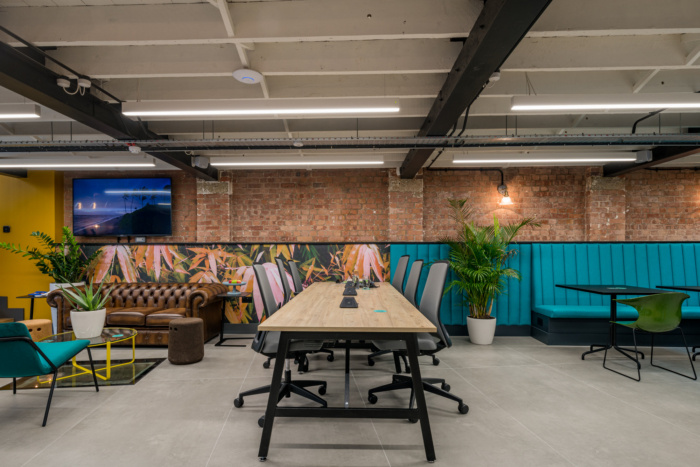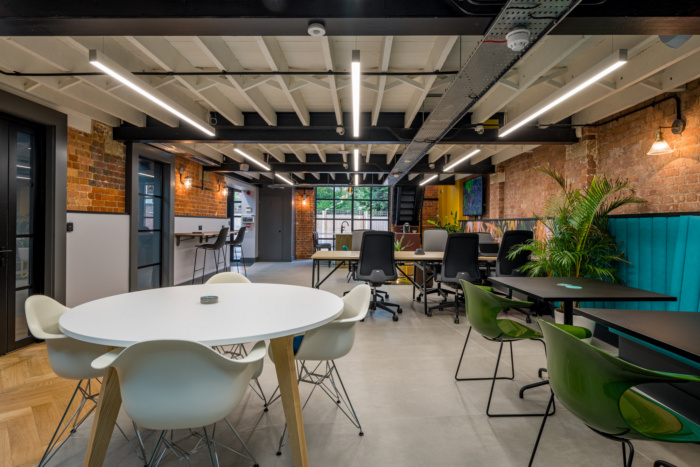 位于原始倾斜屋顶下方的第一层空间被设计为一个更安静的空间,配有固定和分配的办公桌。地板采用木材制成,后窗采用黑色框架和临界风格,与底层的窗户和分隔墙相匹配,侧壁和大部分前后墙都是喷砂砖,再次庆祝原始建筑结构。#写字楼办公空间设计装修#