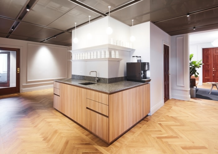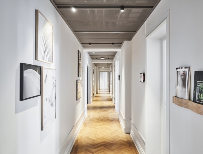 精致的细节与较重的橡木和实木材料形成鲜明对比。如今,占地1,800 平方米的两层楼包括60个工作场所,这些工作场所的特点是自然风光、传统工艺和现代设计巧妙结合。#高端办公室装饰设计#