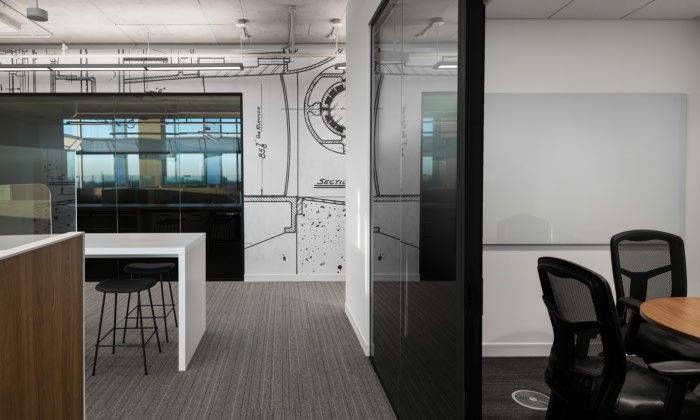 象征着环保意识态度的定制艺术品装饰在空间墙壁上,手绘建筑图纸制作的图形也是为了庆祝公司的光辉历史。各种工作环境遍布各处,更能随处享有城市美景。