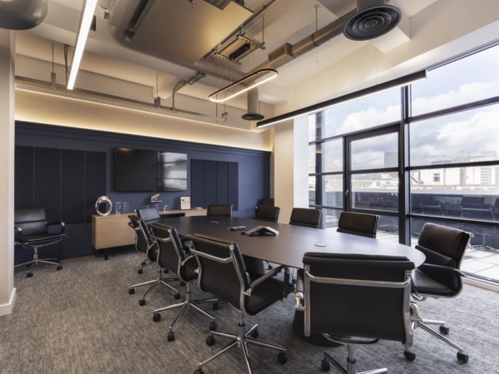 该方案的材料处理包括温暖的木材色调;蓝色和赤褐色内饰饰面以及特色深蓝色油漆饰面与主要的中性灰白色相映成趣。还有中性和有质感的壁纸,深蓝色和斑驳灰色声学饰面,木炭灰色和米色混合地毯,表面饰面,包括大理石、灰色和黑色层压板,以及黑色染色层。