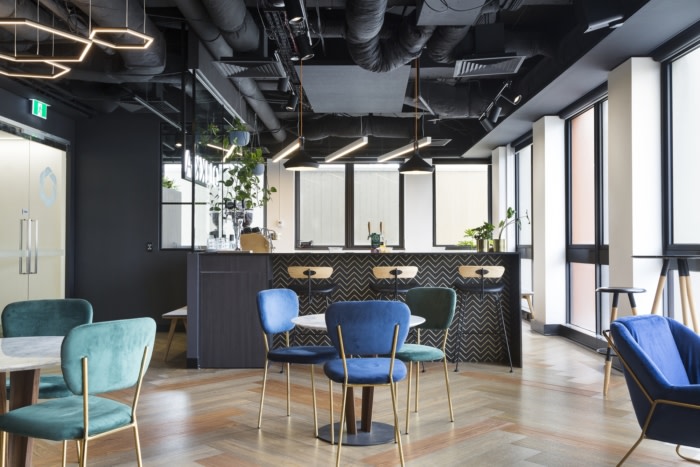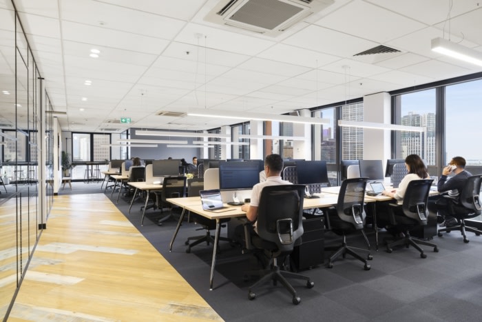 每个工作环境都由单独的品牌颜色定义,茶色和黄色用于突破,蓝色用于工作区,橙色和黑色用于酒吧和社交中心,带有不对称的符号元素,也与企业品牌标识有关。#办公楼写字楼装修#