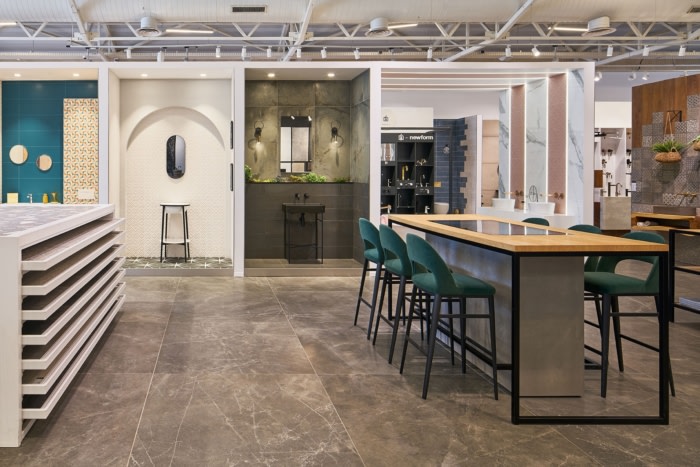 尽管展厅里展示了许多产品,但企业工作的主要目标是为参观者创造一种开放和愉快的感觉。出于这个原因,设计师决定只使用黑色、灰色和白色,并避免在入口处设置高大的展示墙,而是将它们放在后面,以便可以看到房间的全景。#高档办公室装修#