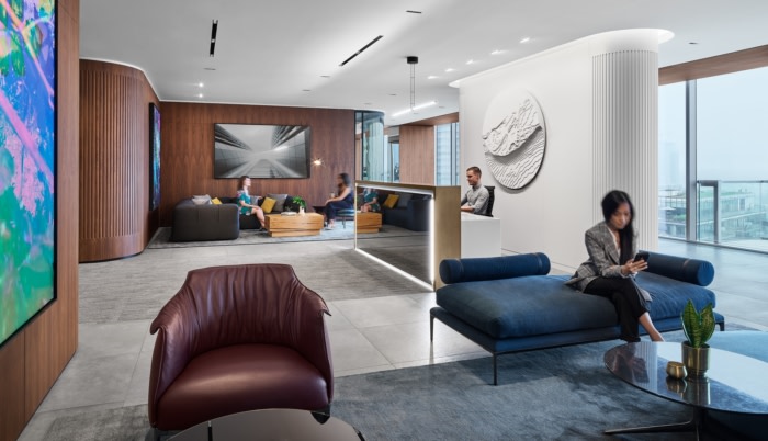 这是一个迷人但低调的工作场所;现代而精致,温暖而诱人,一走出电梯就能感受到。在接待处,可以看到现代和传统设计细节的结合。铆接科林斯柱式参考与反映办公室活动的镜面桌子轻松混合。