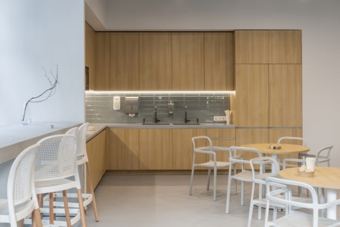 员工身心的舒适已成为建筑师的关键任务。员工自己可以使用灵活的工作场所系统最有效地组织他们的工作——他们可以自由选择开放空间的座位或办公桌、图书馆的摇椅、带软床垫的窗台或其中一个“电话亭”,这些都是非常适合音频会议和需要集中注意力的工作。开放空间配备荧光笔、软木和石墨表面,用于演示和快速聚会。