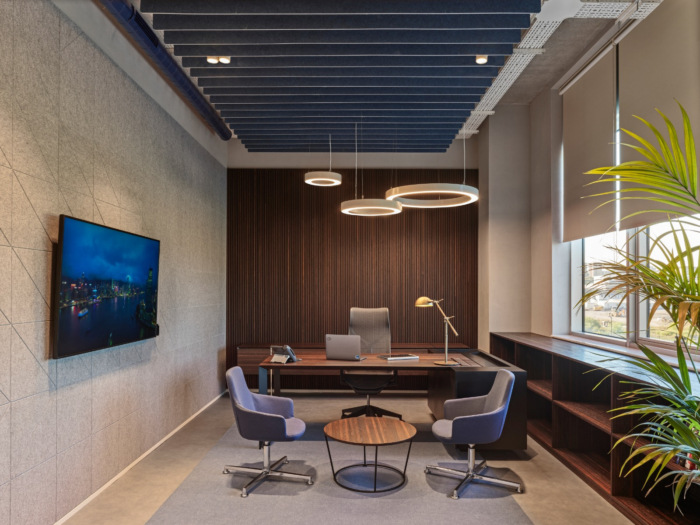 隔音在开放式办公室中极为重要。为每个团队保留的特定枢纽的天花板采用“Feltouch”生产和实施的定制声学元件设计。在墙壁上,我们使用了“Heradesign – 木丝”声学解决方案。