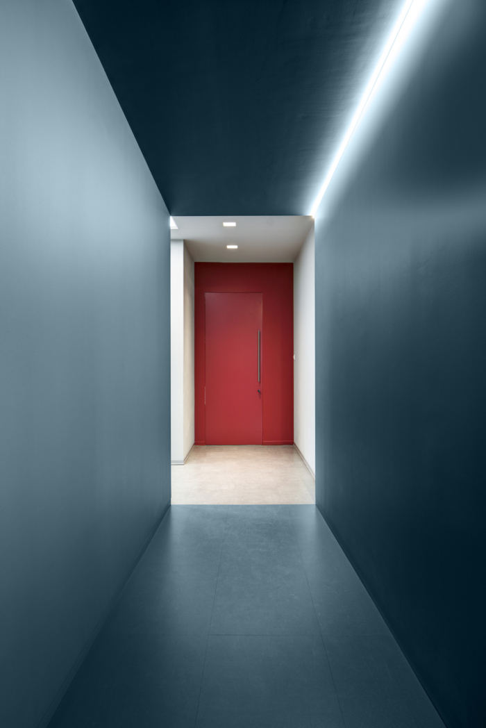 回到大厅,一条走廊的墙壁被漆成蓝色,角落里的霓虹灯以新概念主义艺术家彼得·哈雷的画为灵感,引导我们穿过紫红色的门到达办公室的开放空间。在这个区域,颜色被用来构建一条视觉路径,从走廊的黑白到红色的门,再到一个大房间,白色的阴影加上重要的蓝色。