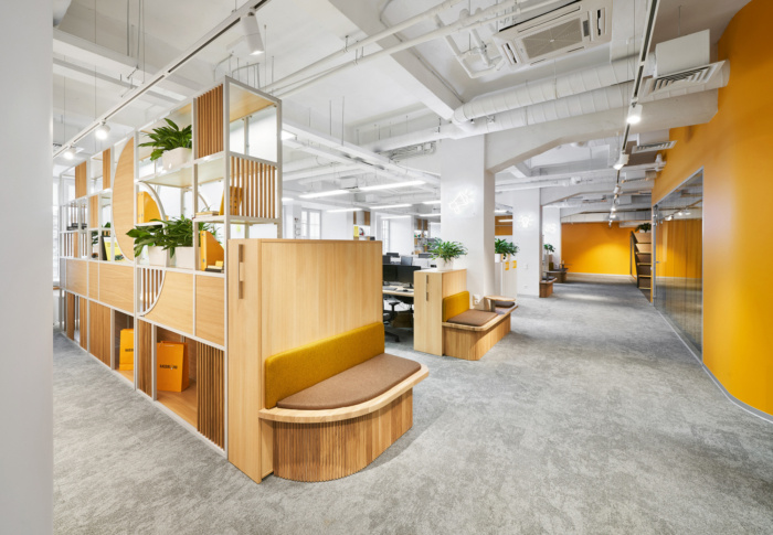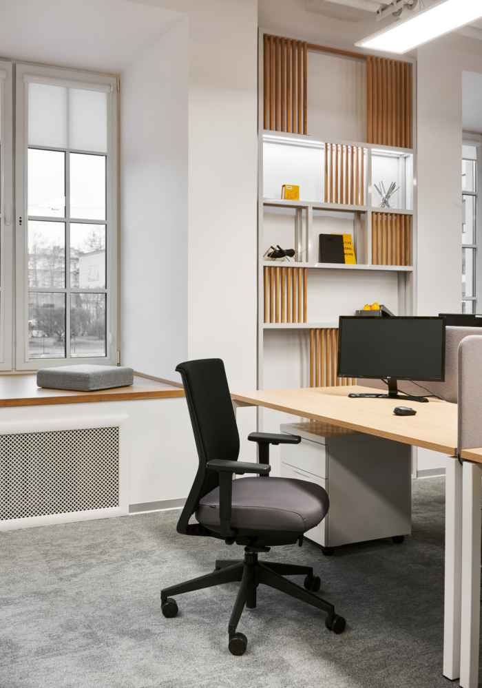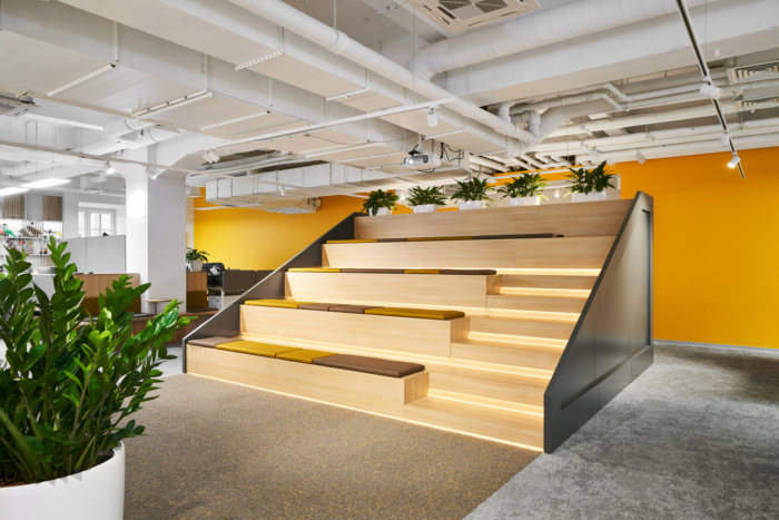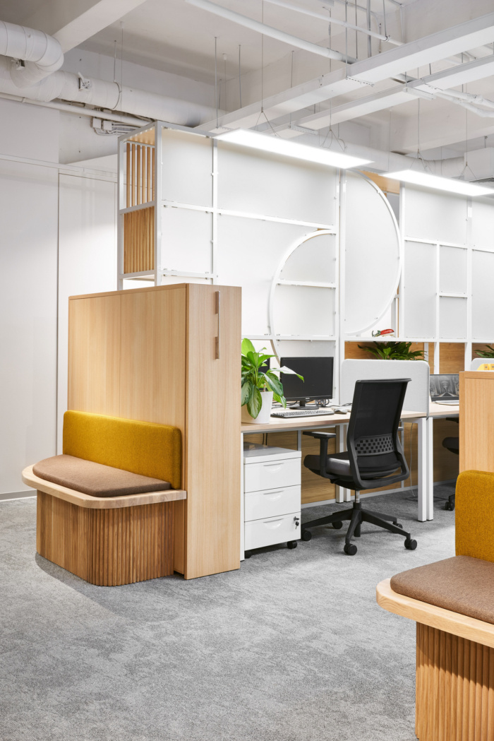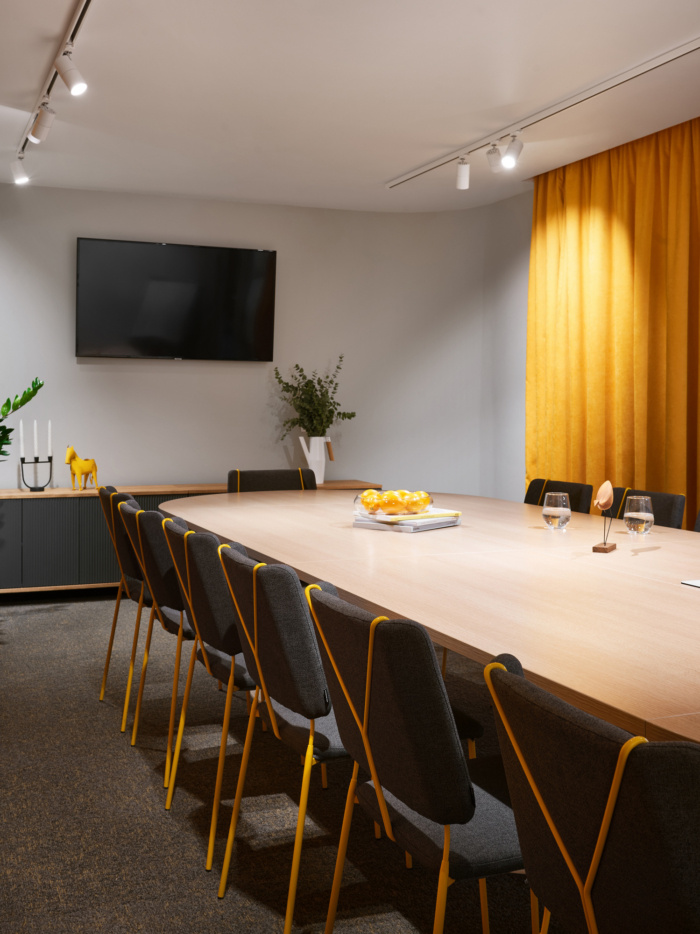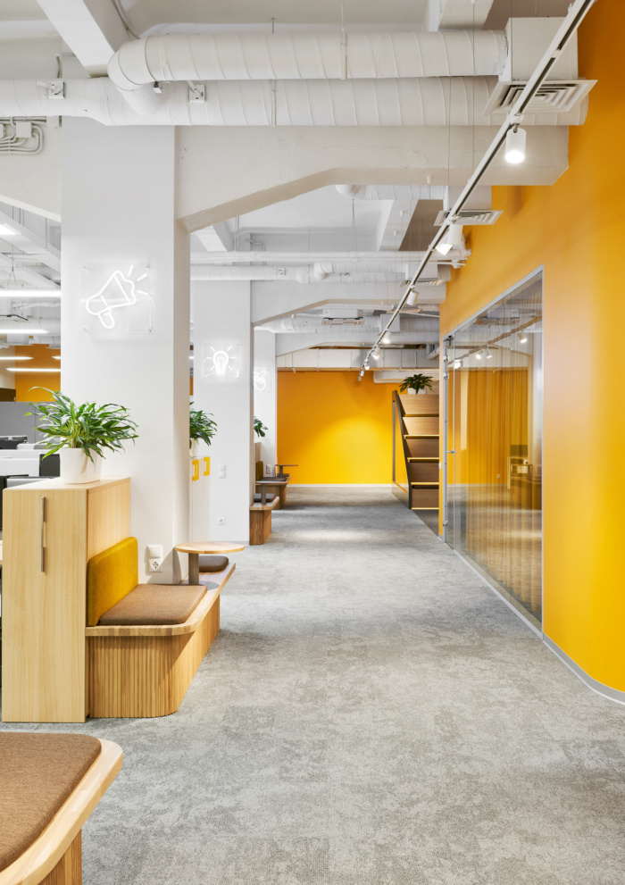 在办公空间规划的中心位置有圆形的会议室,将开放空间分成两个翼,室内设计的主要颜色是黄色。会议室墙壁有隔音填充物,隔音窗帘完全阻隔一切噪音。大约50个工作场所位于工作区。每个工作场所都有桌面隔音屏,部门之间由楼层高的移动隔断隔开。便利的内置座椅和桌子位于过道沿线,可让您舒适轻松地使用笔记本电脑工作或与同事交谈。#广州设计公司#
