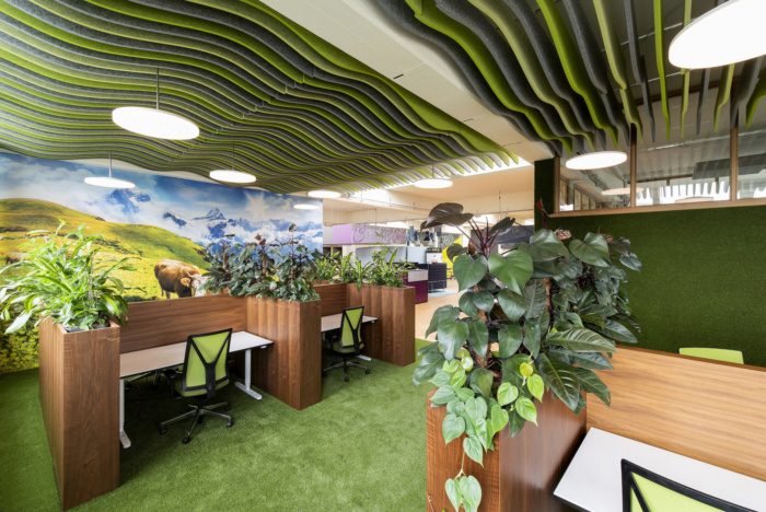 个别办公室根据当地濒危植物命名和设计。考虑到亲生态方面,大部分空间都用植物装饰,比如枢纽后部安静的焦点区域,木制办公桌隔板顶部是植物,墙壁图形反映了与瑞士奶牛贝尔塔一起监督活动的山地牧场。