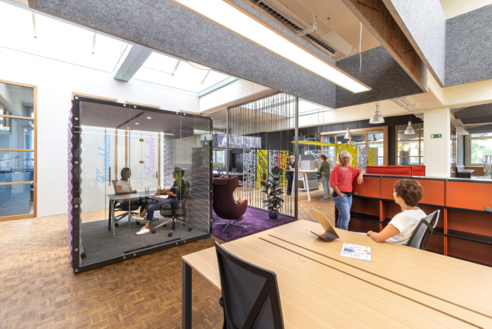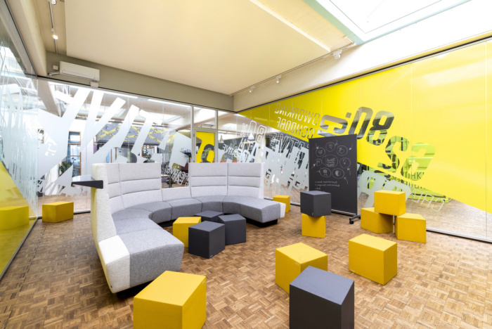 除了开放和封闭的联合工作区,还有电话亭式的私人工作空间、更大的团队工作展位和一个用于工作坊或产品展示的亮黄色创意空间。房间由玻璃隔断墙分隔,并配备大型触摸屏和便携式家具,以实现最大的灵活性和创造力。