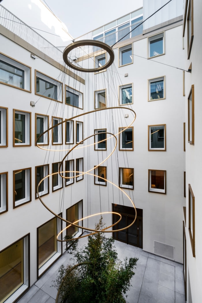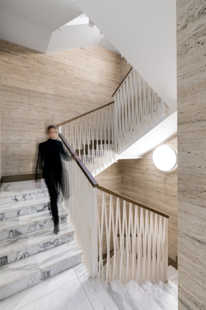 事实上,自然光始终起着主要作用。巨大的玻璃体量俯瞰着沿每一层布置的宽敞露台和阳台,而一个通向主庭院的地下花园照亮了公共区域和代表性区域所在的地下室。