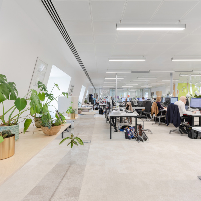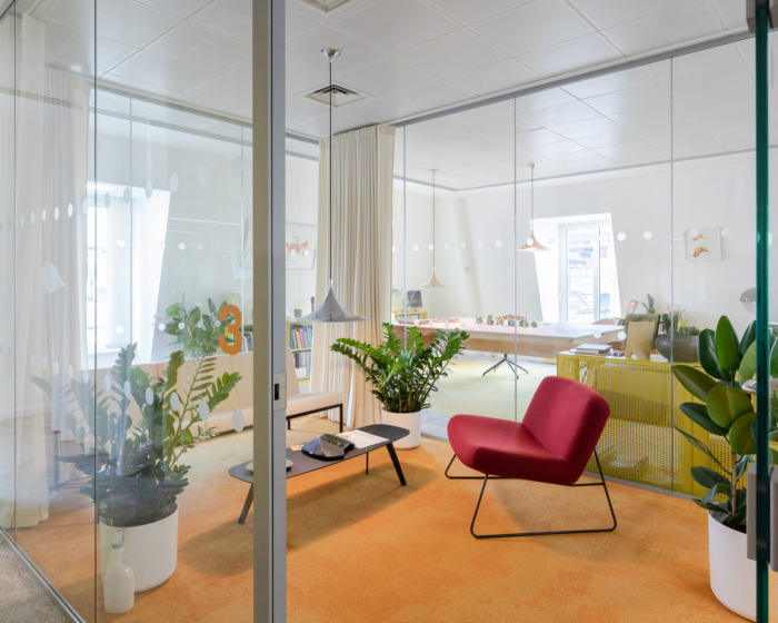 整个玻璃或镜面隔断最大限度地提高了空间感,而办公室空间中元素的方向和设计则最大限度地利用了日光。几乎所有元素(窗帘、隔板)都是南北走向,以保持尽可能多的北极光。尽管存在明显的矛盾,但这些策略同时实现了开放性和隐私性。