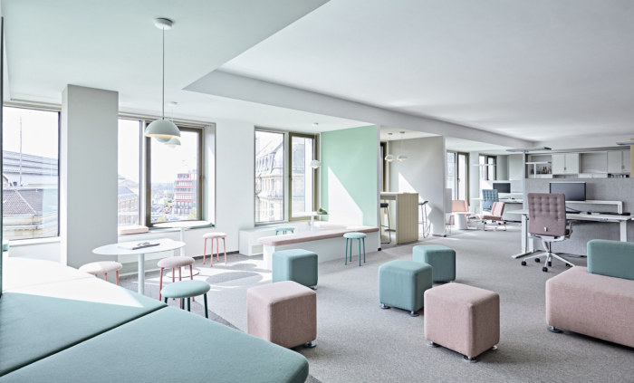 设计理念与企业各个实体的 CI 颜色保持一致,并将它们结合在松散的家具和室内装潢材料、地板饰面和墙壁织物中。