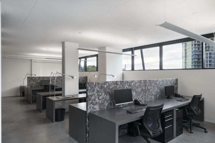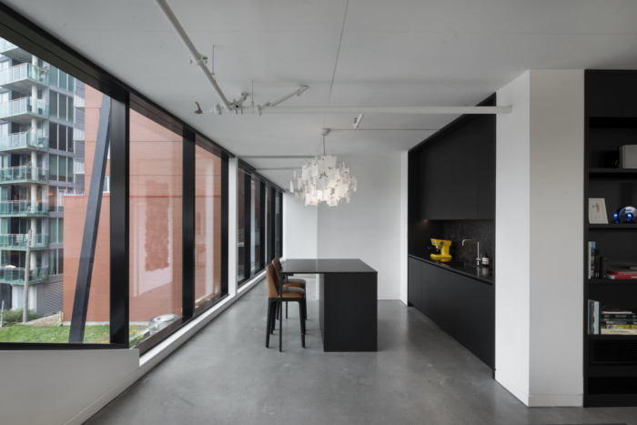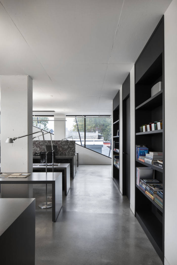 整体橱柜,全黑色,与房间的门结合在一起。他们创建了一个集合并将空间连接在一起。忠实的供应商参与了这个办公室陈列室:恋物癖灯、梳妆台和用魁北克石头装饰的厨房、当地工匠制作的家具、艺术品、地毯等。