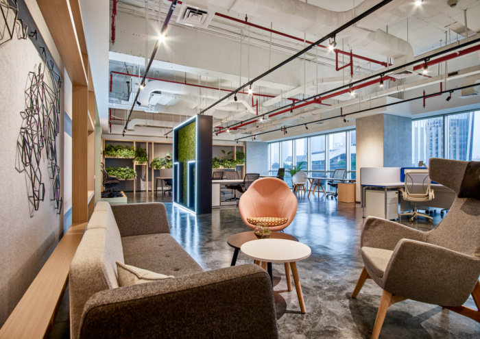 整个空间中使用的原始和自然饰面和纹理,如水泥、木材、毛毡和金属,传达了诚实、真实、工艺和人性化的方法。未来派特色标牌墙欢迎参观者,其标志以黑钢、LED 灯和苔藓作为背景重新诠释。陈列室和办公区相互连接,然而,带有传统印尼剪裁图案的屏风创造了一种隐私感。#办公空间设计#