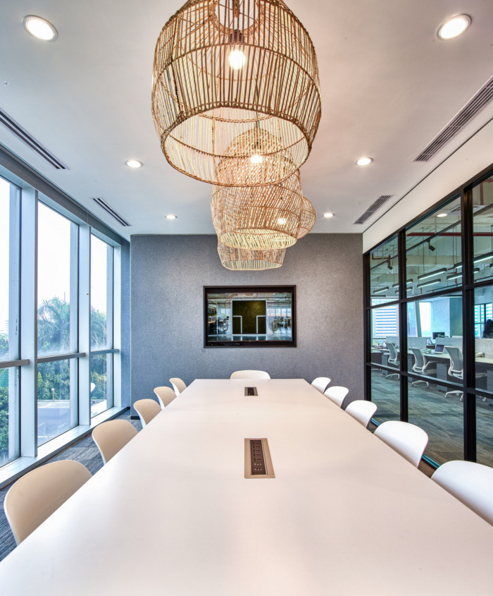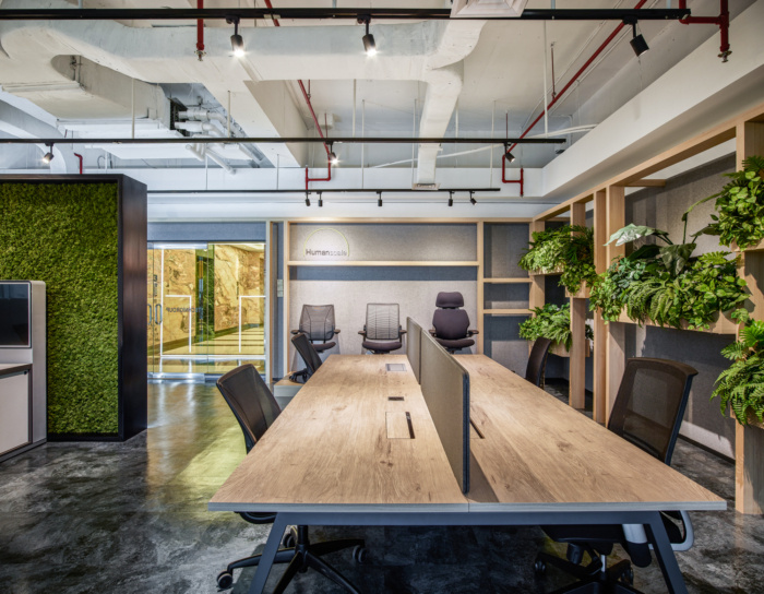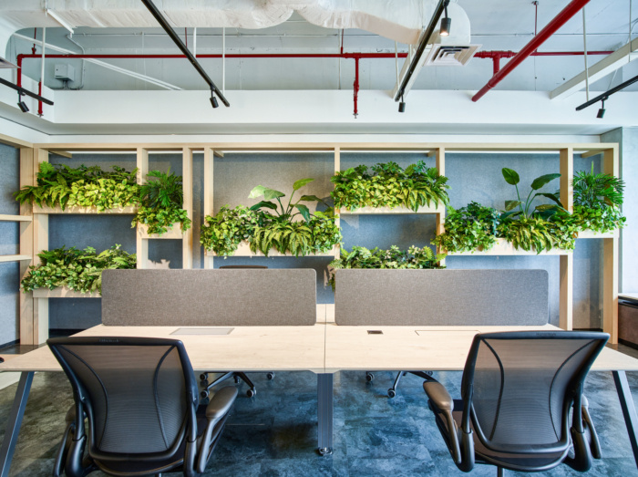 开放式天花板最大限度地提高了整体高度,而覆盖着毛毡的墙壁提高了开放空间的声学质量。“包裹”陈列室区域的木结构灵感来自传统的印度尼西亚建筑技术。与可固定的毛毡墙一起,它为样品和模型创建了一个灵活的显示系统。办公区的家具是单色的白色或黑色,与当地工匠手工制作的质朴木台面和藤灯并列。入口处的特色苔藓墙和陈列室区域郁郁葱葱的种植园传达了品牌以可持续发展为重点的方法,并在视觉上与周围环境联系起来。