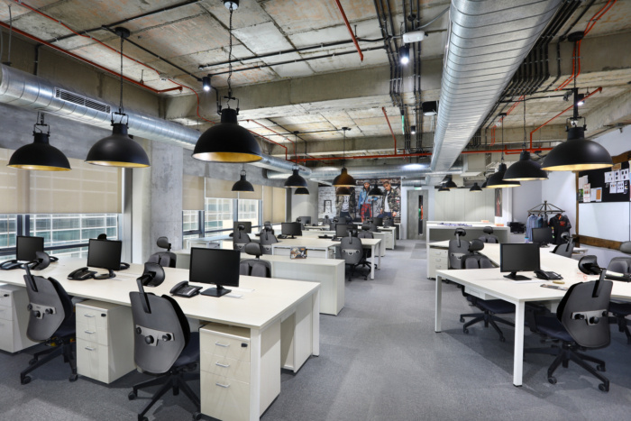 这个办公室令人惊叹的因素是原始和工业外观,它贯穿整个空间。接待区拥有未加工的混凝土饰面墙壁和地板,配有复古皮革沙发,与卧铺木家具相得益彰。裸露的天花板和工业灯丝灯具与外观相得益彰。一个有趣的因素是休息室会议室,它具有与整个办公室不同的现代感和现代感,黑白壁画突出了霓虹色沙发和明亮的躺椅。