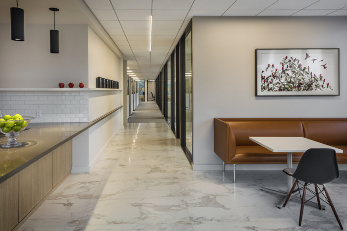 设计目标是实现团队对现代、光线充足、引人入胜的办公空间的愿景,设计团队通过将浅色天然木材色调和白色大理石与深色口音(如玻璃和门框以及灯具饰面)进行对比来做到这一点。这种组合使整体感觉明亮通风,但增加了现代感。