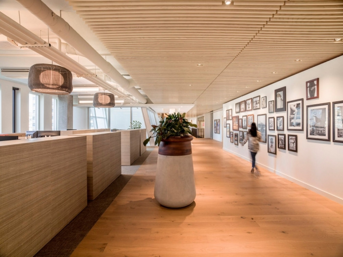 一条宏伟的“木板路”用于组织空间,将客人从主大厅和接待处吸引到陈列室和模拟商店以及协作工作区。木板人行道上的休闲座位区为非正式聚会提供了机会。自然光通过充足的外部玻璃窗涌入办公室,最显着的是通过三个大型全玻璃监视器,这些监视器投射到流通空间中,并在视觉上将每一层楼与下面的市场大厅连接起来。