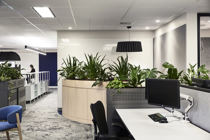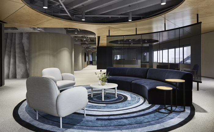 凹槽混凝土墙与天鹅绒家具内饰也形成了对比;在人流量大的区域,山羊毛地毯紧靠硬质石英地毯。#现代化办公室装修#