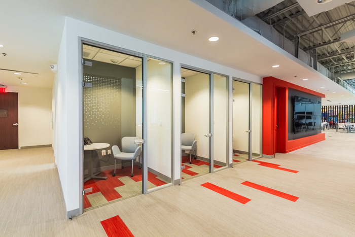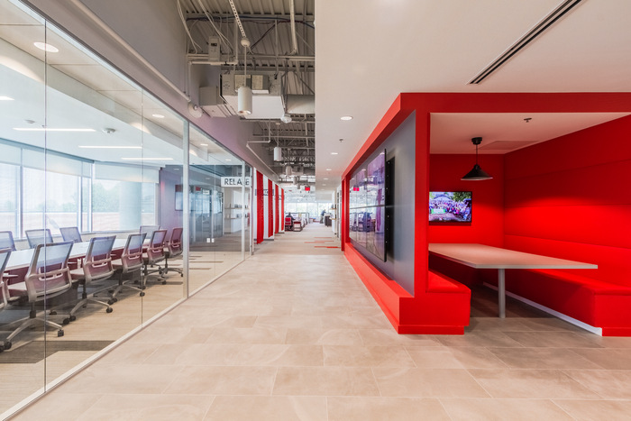 办公室周围还散布着协作“中心”,如内置展位和生雪松扔下的桌子,以增加员工之间的协作元素。大咖啡馆战略性地放置在接待处附近,为来访的聚会营造温馨的氛围。咖啡厅还充当所有员工的“枢纽”或聚会点,促进互动机会。