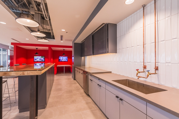 在建筑工地上发现的原材料的创造性使用与现代元素相结合,创造了一种独特的并置。宽翼缘垂直梁可以看作是接待处和咖啡厅之间的房间分隔,以及咖啡岛上的腿和扔下的桌子。咖啡厅水槽处暴露的管道和浇筑的混凝土台面营造出有趣的视觉效果,并向建筑工人每天处理的材料致敬。