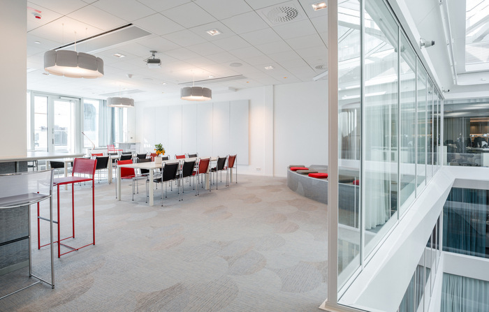 大多数员工在开放式办公空间工作,既有经典的办公桌,也有落地桌。宽敞的聚会和会议室区域为空间增添了光彩。此外,还有一个带舞台和灵活家具的礼堂,可用于多种不同的布置和客人数量。
