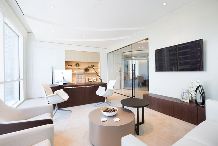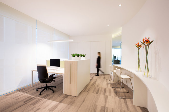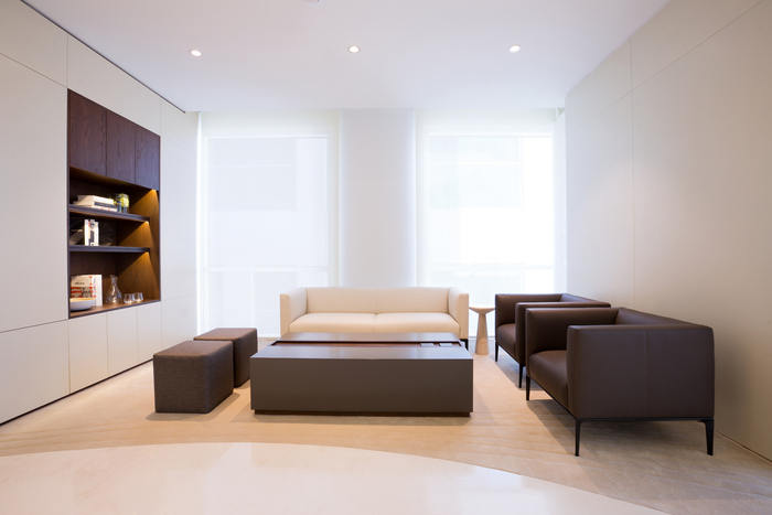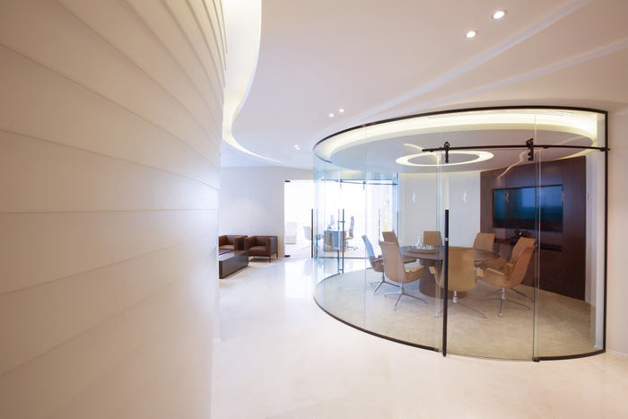 空间规划围绕一系列曲线设计,引导您穿过空间。设计师在中央会议室的墙壁上使用了弧形玻璃来延续这个非线性主题。天花板上的线条和定制设计的地毯进一步强调了空间中“流动”的概念。