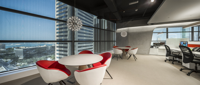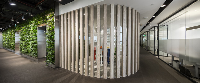 在主要销售大厅的喧闹声中,是一堵长长的绿色墙壁的对比平静。围绕销售大厅的全长平面的宽大体现了元素的极简主义。办公室的设计创造了各种会议中心,旨在营造不同的氛围。设有户外主题会议室、作为主会议室的别致框架木箱、带软垫的电话亭以及享有壮丽景色的非正式会议区。一扇隐藏的门通向意想不到的巨大储藏室。