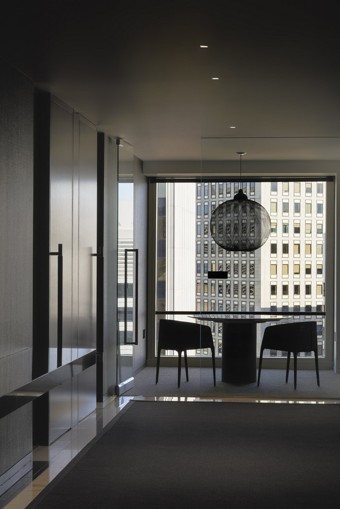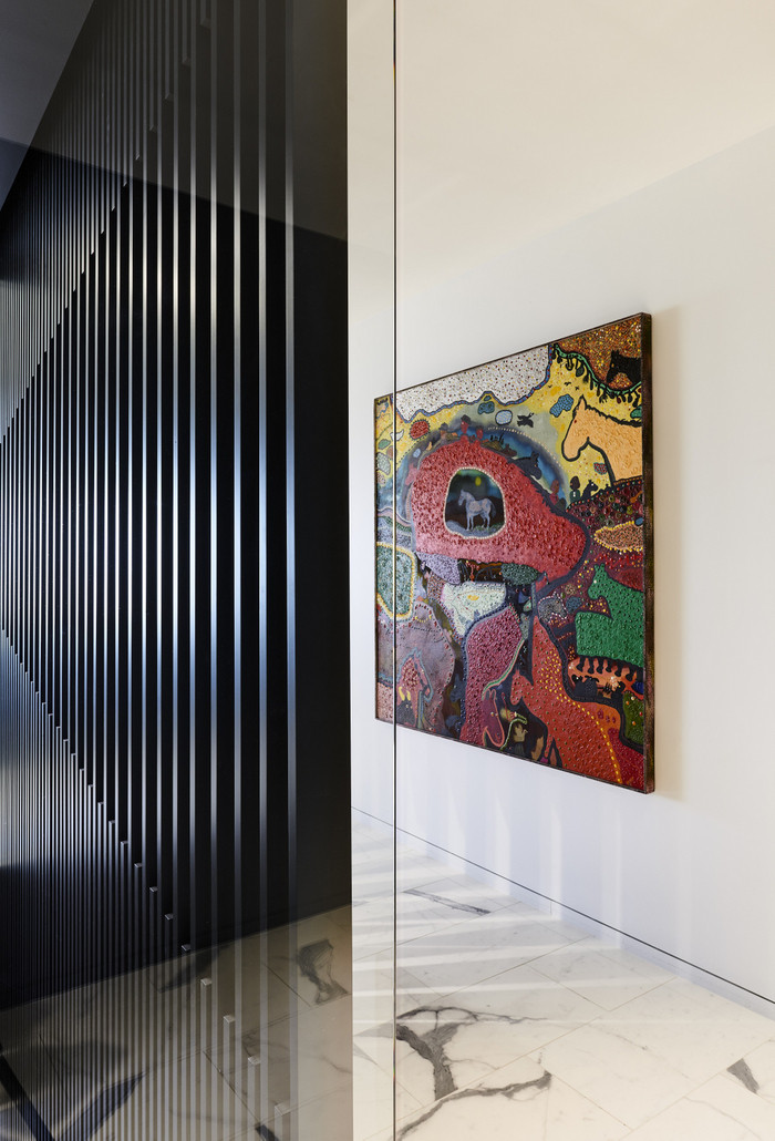 设计团队提议的白色、灰色和黑色调色板作为他们大量艺术品收藏的中性背景,并提供了戏剧性的照明机会。配色方案不仅描绘了字面上的对比,而且象征性地转变了他们最近离开渡轮大楼的更传统的法律环境。