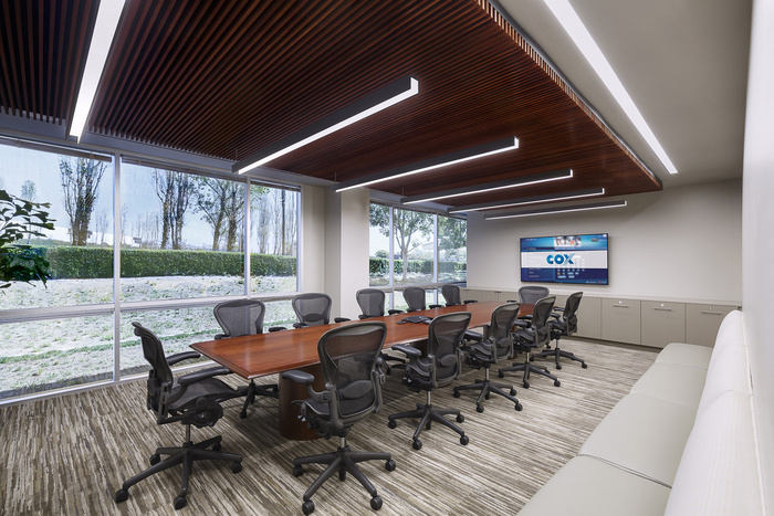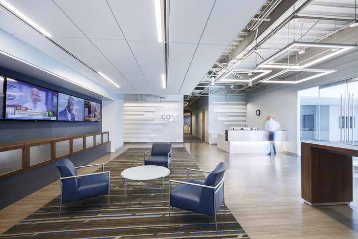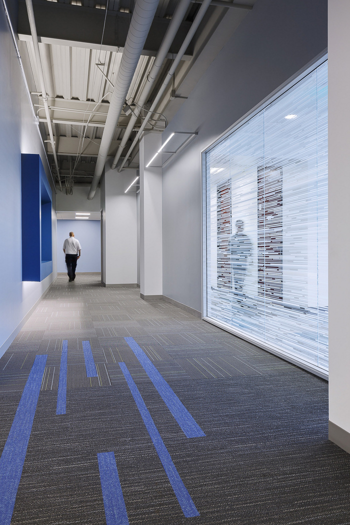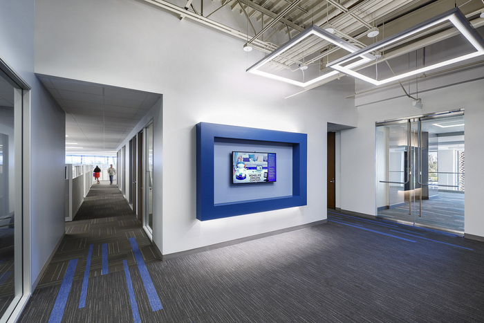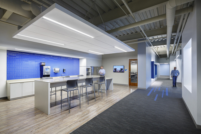 明亮的白色外露天花板和管道系统与整个空间的灰色地平面形成对比,“考克斯蓝”的流行音乐随处可见。开放式休息区的玻璃挡板、座椅装饰和干墙装饰墙比比皆是。由此产生的设计是对企业品牌的清晰而有意义的诠释。