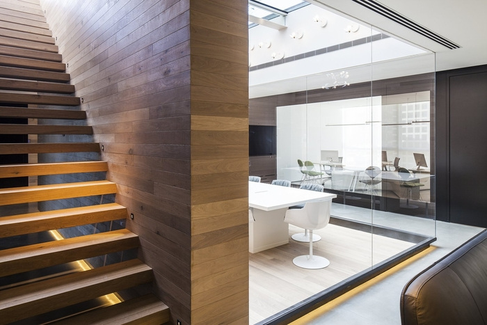 水的半透明特性在整个大堂区域营造出动态的照明效果,同时允许从主楼层欣赏屋顶露台的景色。材料连接是通过主会议室的木材迁移,通过反射池,通过楼梯的木复合墙到达露台层,然后沿着露台的反射池变成走道栏杆。#办公室内装修#