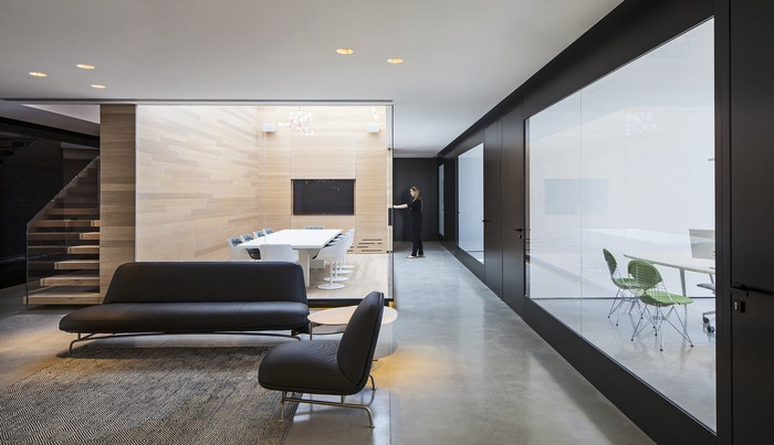沿轴向视图的分层透明:沿东/西轴线保持不同程度的透明度,用户从东面最大的会议室,穿过核心的电梯大堂,接待大厅,它后面的封闭办公室一直到外部可以看到西面大海的幕墙。建筑的核心被黑色玻璃覆盖,增加了空间层次感。办公室玻璃周围的黑色带子强调并勾勒出海洋的景色。