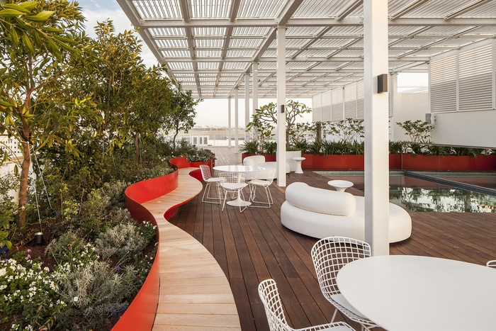 空间的流动连续性:另一个设计原则是屋顶露台空间与办公楼层之间的联系以及两个层次之间连续性的概念的体现。这个想法是通过视觉联系和材料连续性来探索的。视觉连接是通过一个玻璃底反射池作为入口大厅主会议室的天花板来实现的。