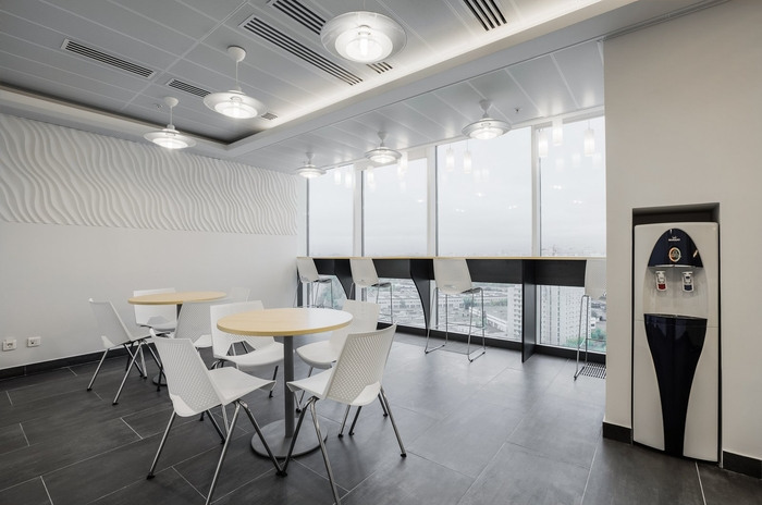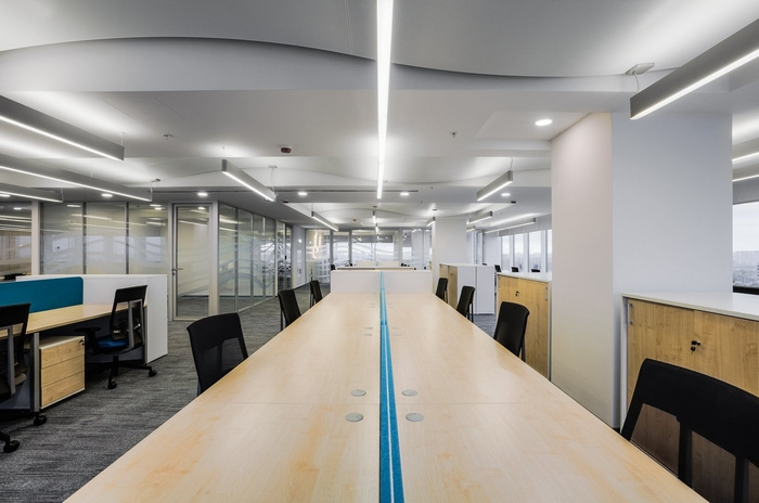 开放空间的照明是为了补充“波浪”天花板 - 与波峰平行排列的线性灯,强调它们的体积并产生眩光,使它们活跃起来。严谨、线性、饱和的办公室设计被不显眼的波浪和水的主题冲淡,伴随着白色和清晰,光影对比,反映在天花板和垫子的设计上。