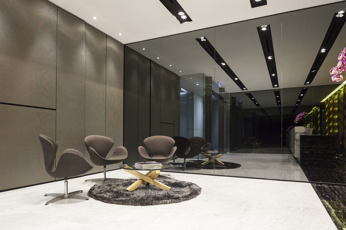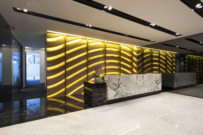 连续的书法装饰图案从墙壁流向墙壁,而地毯地板上的颜色就像墨水从一层渗透到另一层一样。通过使用这样的设计设备,办公室空间被巧妙地塑造成流畅的空间,在清晰界定边界的同时,无缝地相互流动。