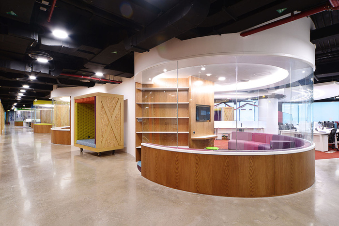 正门的灵感来自地铁站,定制的地毯展示了彩色地铁地图,将游客与介绍性屏幕板连接起来,其中介绍了 企业的五个部门的引人入胜的介绍(对于游客来说,进入办公室就像开始一段创意之旅)。#办公空间设计#