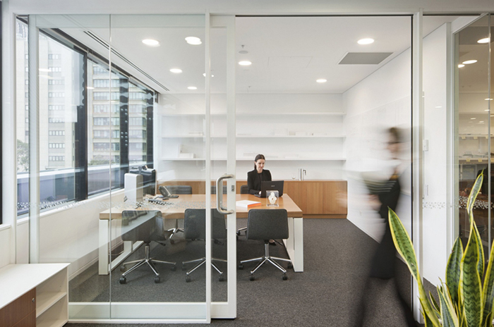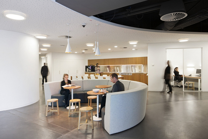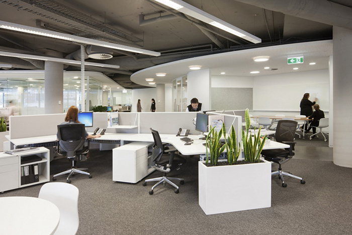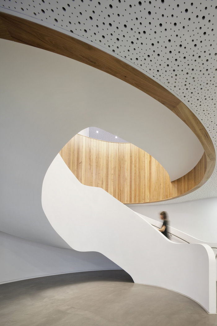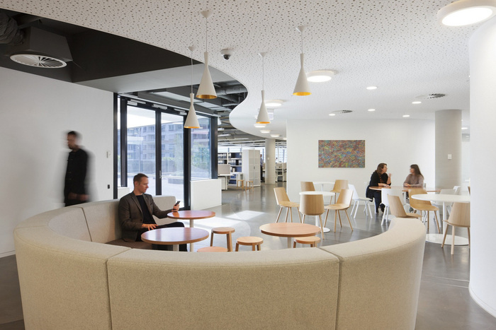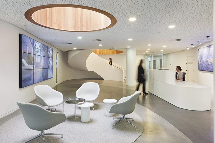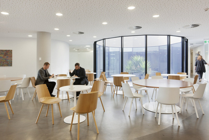 将外面拉进来,圆形的光井鼓励自然光穿透深地板。参考公园,内部花园中庭有助于将接待区与社交休息空间连接起来。可以从工作区和客户会议套房直接进入外部屋顶露台。
