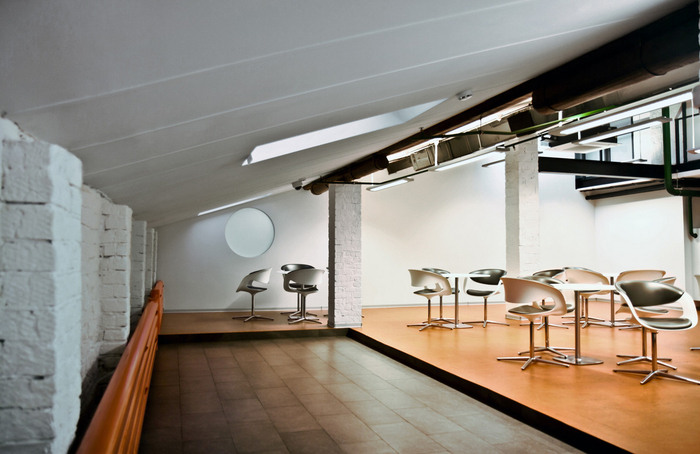 天花板上开放的通信线路,复杂几何盒子中独特的吸顶灯,还有花朵拖到天花板上的复合花盆。壁龛沙发被用作明亮的颜色点,以及非正式交流的场所。墙面装饰传统上是工业地毯、标记覆盖物、软木;当然,还有浇筑的地板。