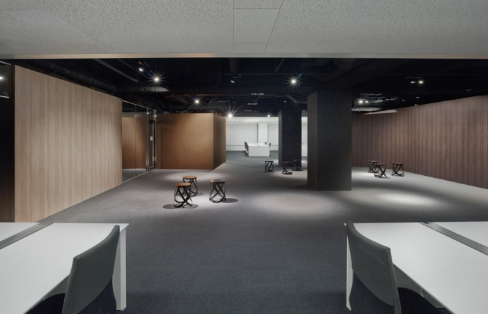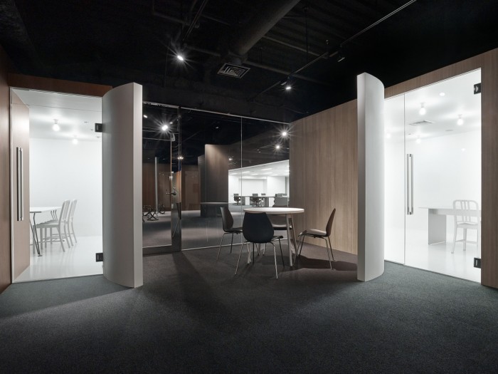 设计师在办公室周围放置了七个不同大小和装修的盒子形状的会议室,所有这些会议室都由一个已经“翻开”的墙。设计师的想法是不仅要使盒子的内部,而且要使它们周围的区域成为一个活跃的办公环境,人们可以轻松地工作和互动。