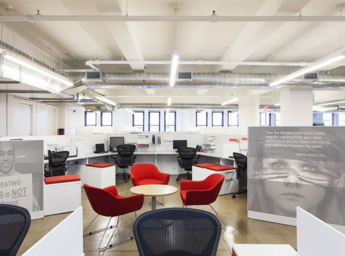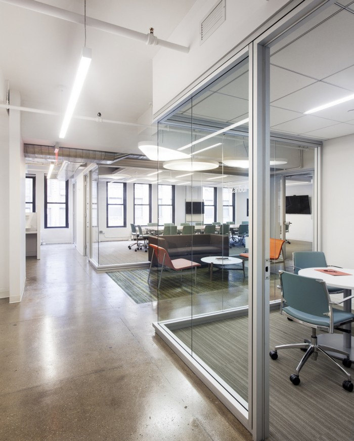 白色和灰色的中性色调辅以干净、现代的材料,如玻璃、混凝土、木材和金属,并通过明亮的色彩搭配以浅绿色和红色装备的家具。灵活的会议室兼作图书馆,可分为三个较小的房间或开放为一个大型会议室,以容纳正式会议和全球访客。分隔墙由玻璃制成,以允许最大量的光线进入室内。