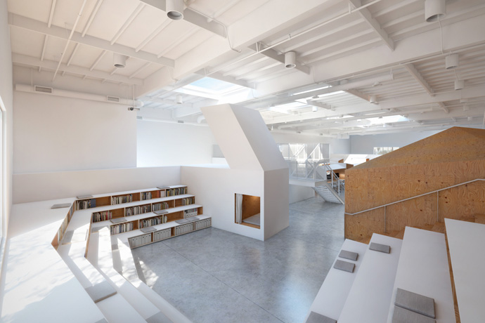 一组书架与组合的在阶梯的场所的结果形式书竞技场,它具有双重功能,可作为办公室范围内会议的储物空间和座位。#现代办公室装修设计#